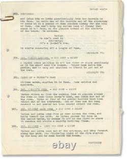 110 leaves, with last page of text numbered 109. Pages Very Good plus, wrapper Very Good plus, prong binding. Laid in script pages Near Fine. Laid in thermo-fax "Tarzan Outline":47 pages, bound with four staples and a paper clip at the upper left corner, Very Good, with creasing along the right edge, and with the last two leaves separated, chipping to the top left corner. Subject: 1950s Cinema, Adventure, Family Film, Film Scripts, Films with Literary Sources.